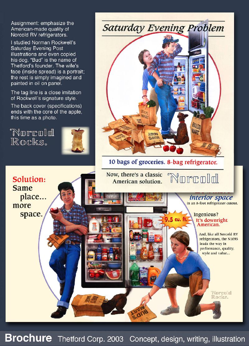 As with the agency, these brochures were my concept, design and photo direction. I also illustrated the Norcold brochure in oils.